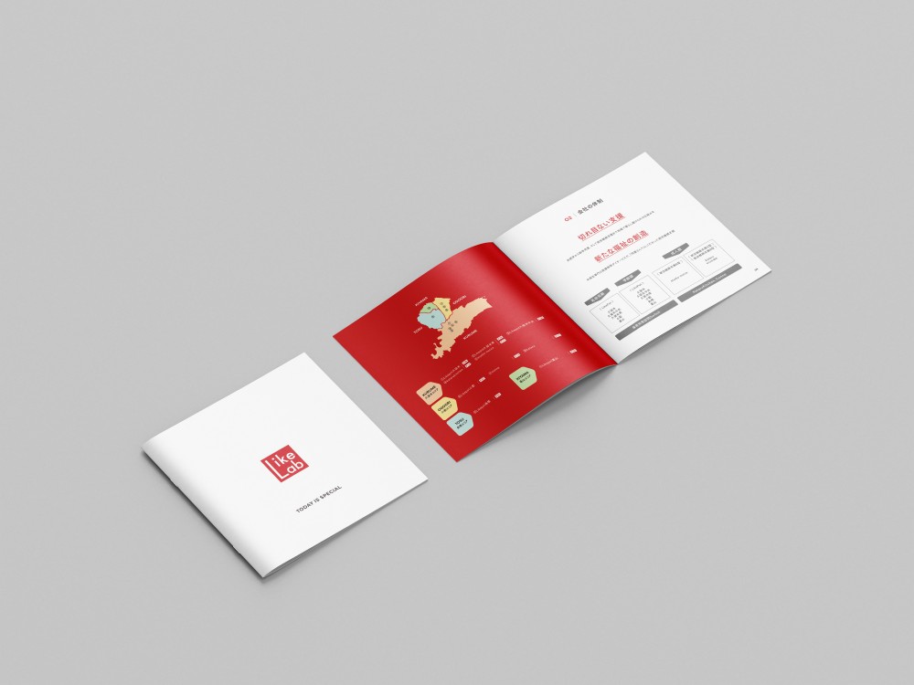 「切れ目ない支援・新たな福祉の創造」を目指すLikeLab様は、様々な区分の福祉施設を展開されています。今までの福祉の常識に捉われず、「子どもたちや働く仲間たちがワクワク出来る仕組みを作りたい」というLikeLab様の思いを、1ページごとにわかりやすく伝えています。また、会社案内の形を正方形のロゴと同じにすることで、LikeLab様らしさをデザインに反映させています。